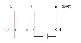 當(dāng)兩繞組完全一樣,電機(jī)可能是三端子接線,1,3為兩繞組的公共接線端,接交流電源的L, 2/4端子之間聯(lián)有啟動電容, 如果交流電源的N端接端子2為正轉(zhuǎn),則N改接端子4為反轉(zhuǎn);如果是四端子,見圖四接線;